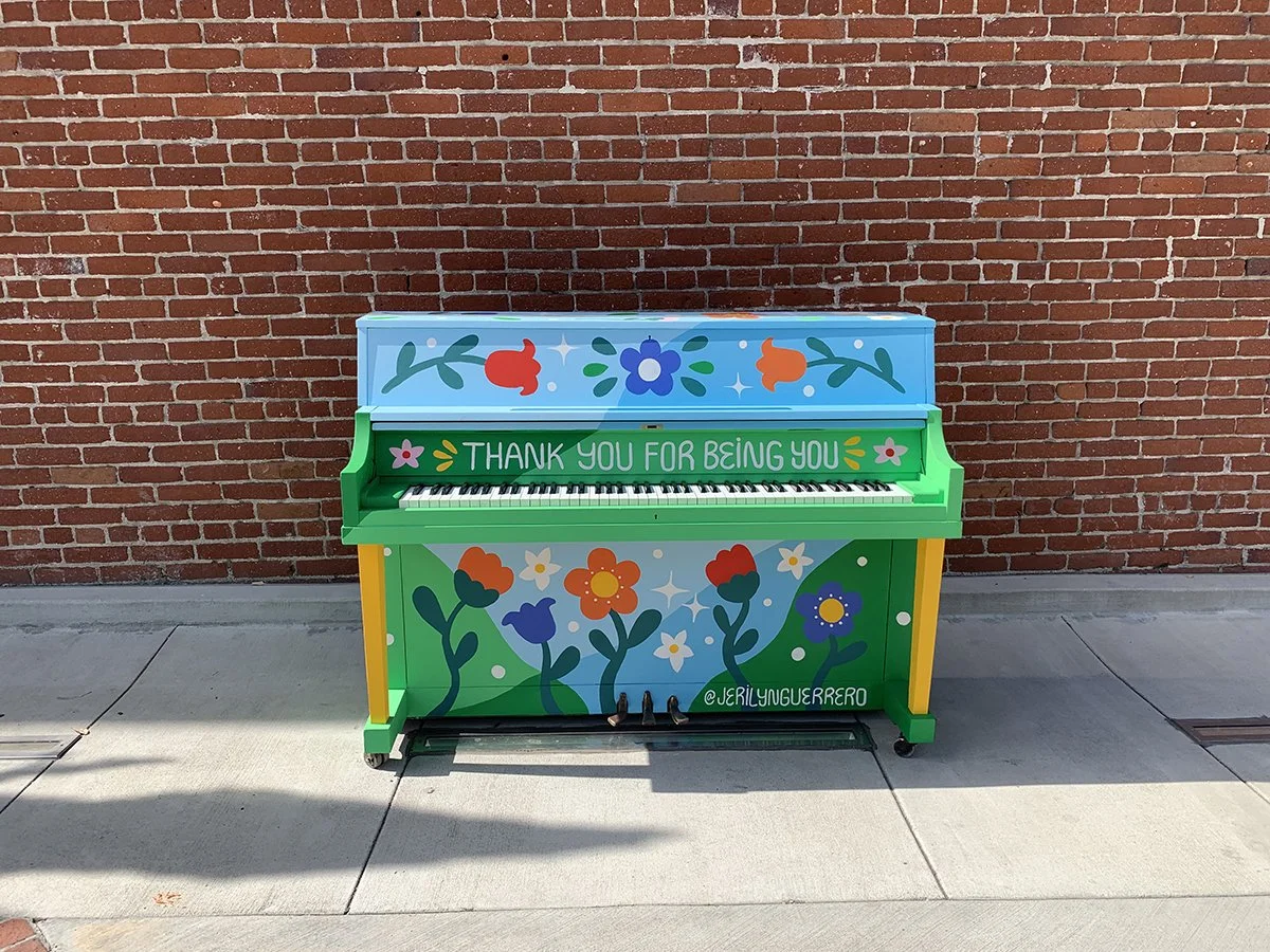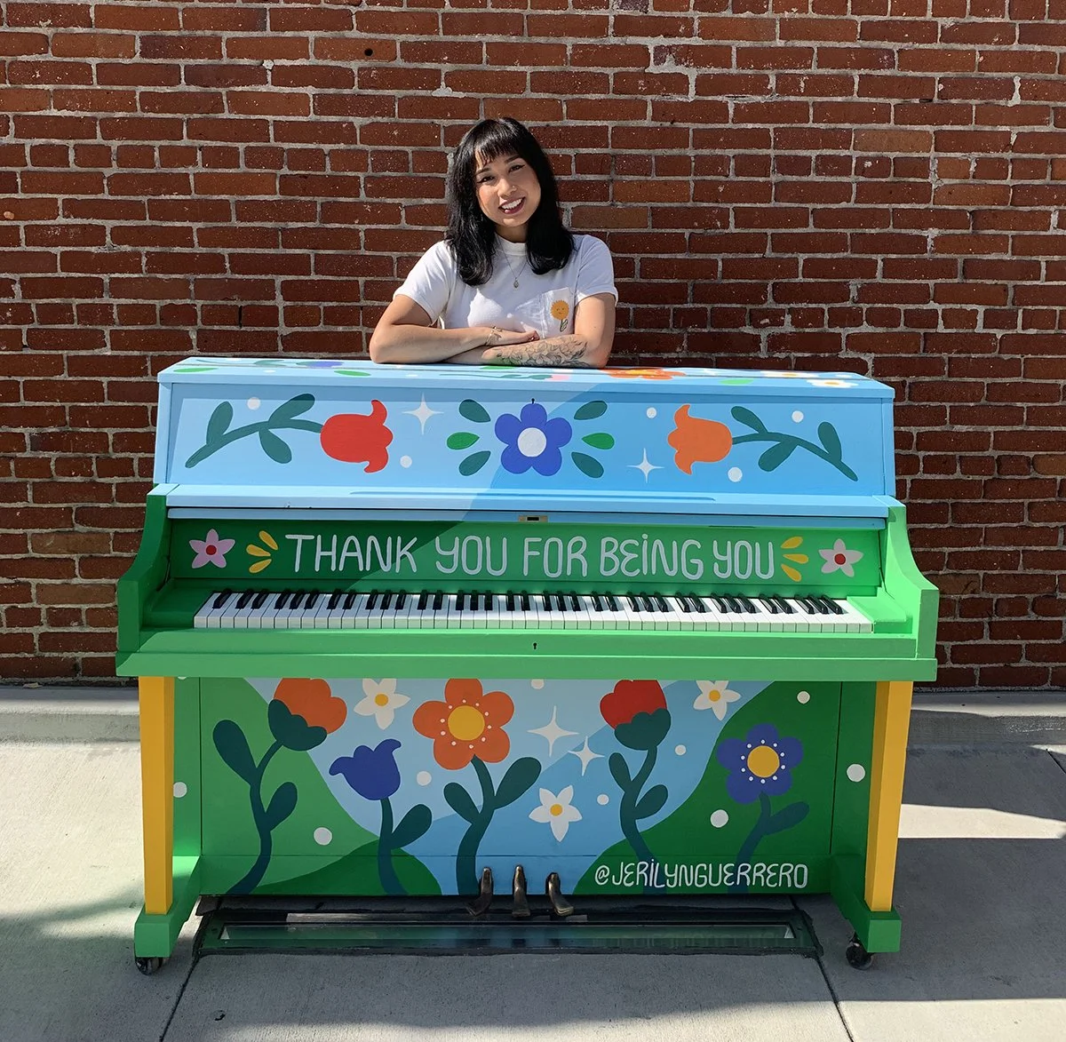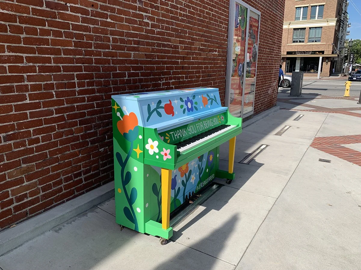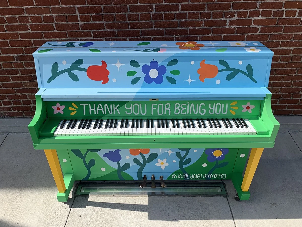 ‘Thank You For Being You’ is a custom mural painted on a piano for the city of Glendale, California as part of a public art project. The piano was made available for the community to use in its’ Central Park Paseo location, just a walk away from the Americana at Brand.